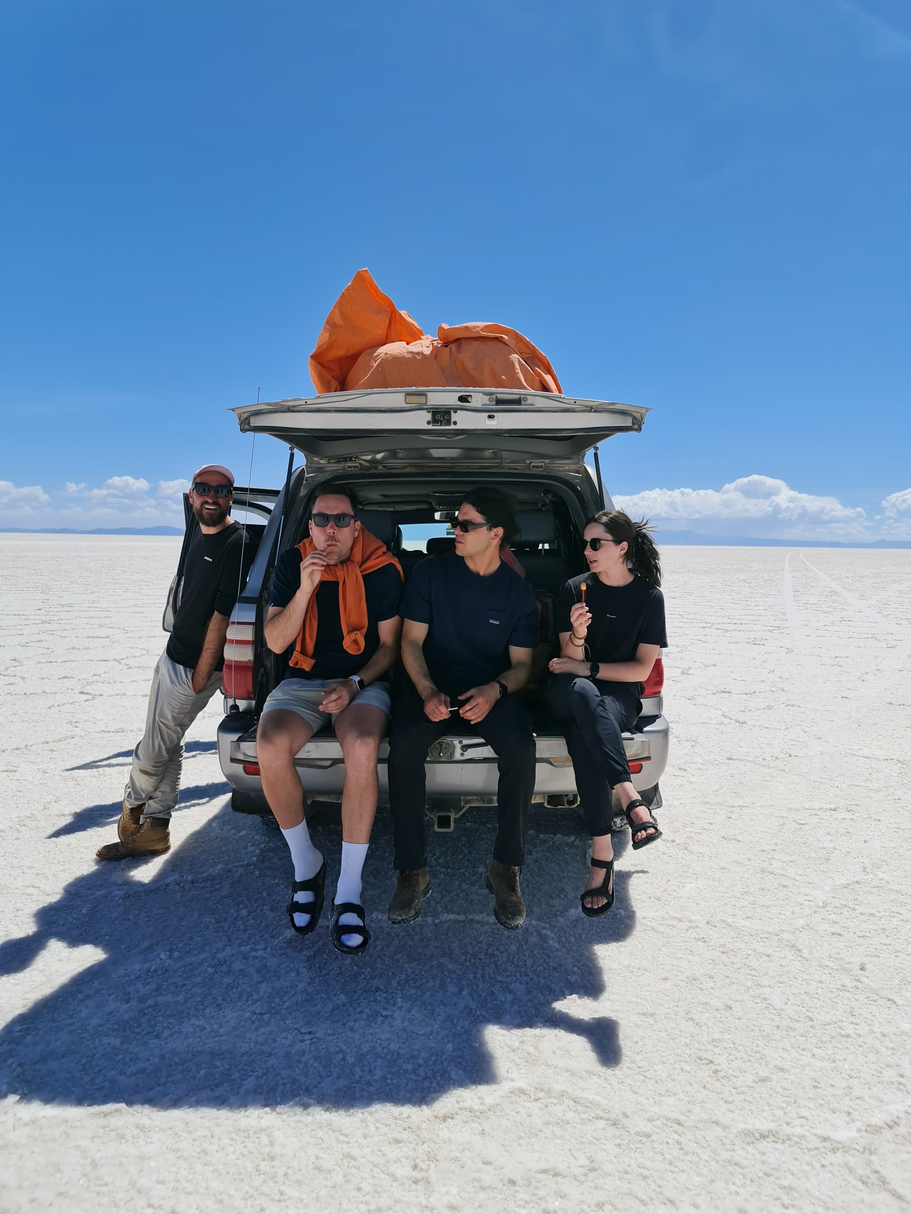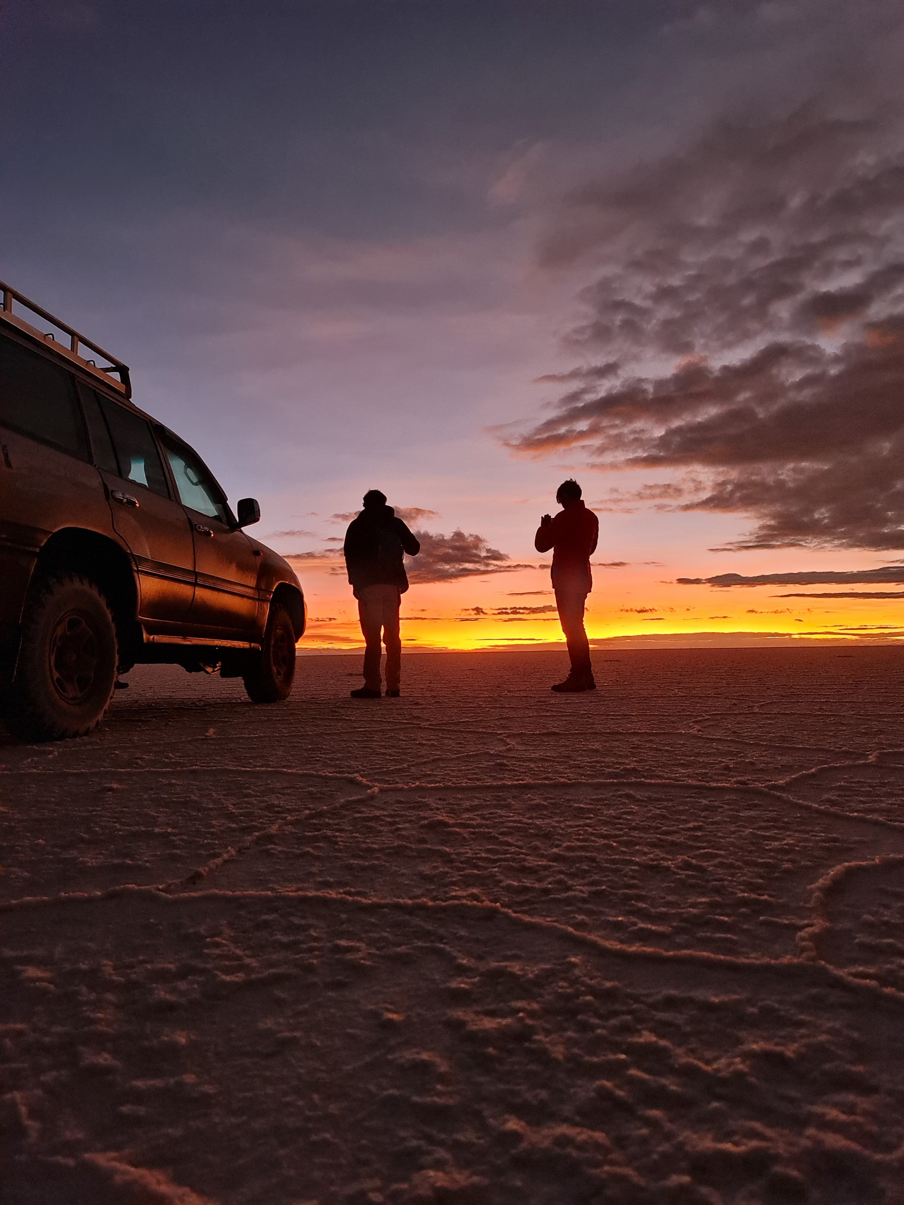 Mid-salar lunch, photos from the midpoint perspective of the Salar, visit to Incahuasi Island, and a sunset on the Salar's shores with wine and snacks. Arrival at the salt hotel on the Salar's edge.
